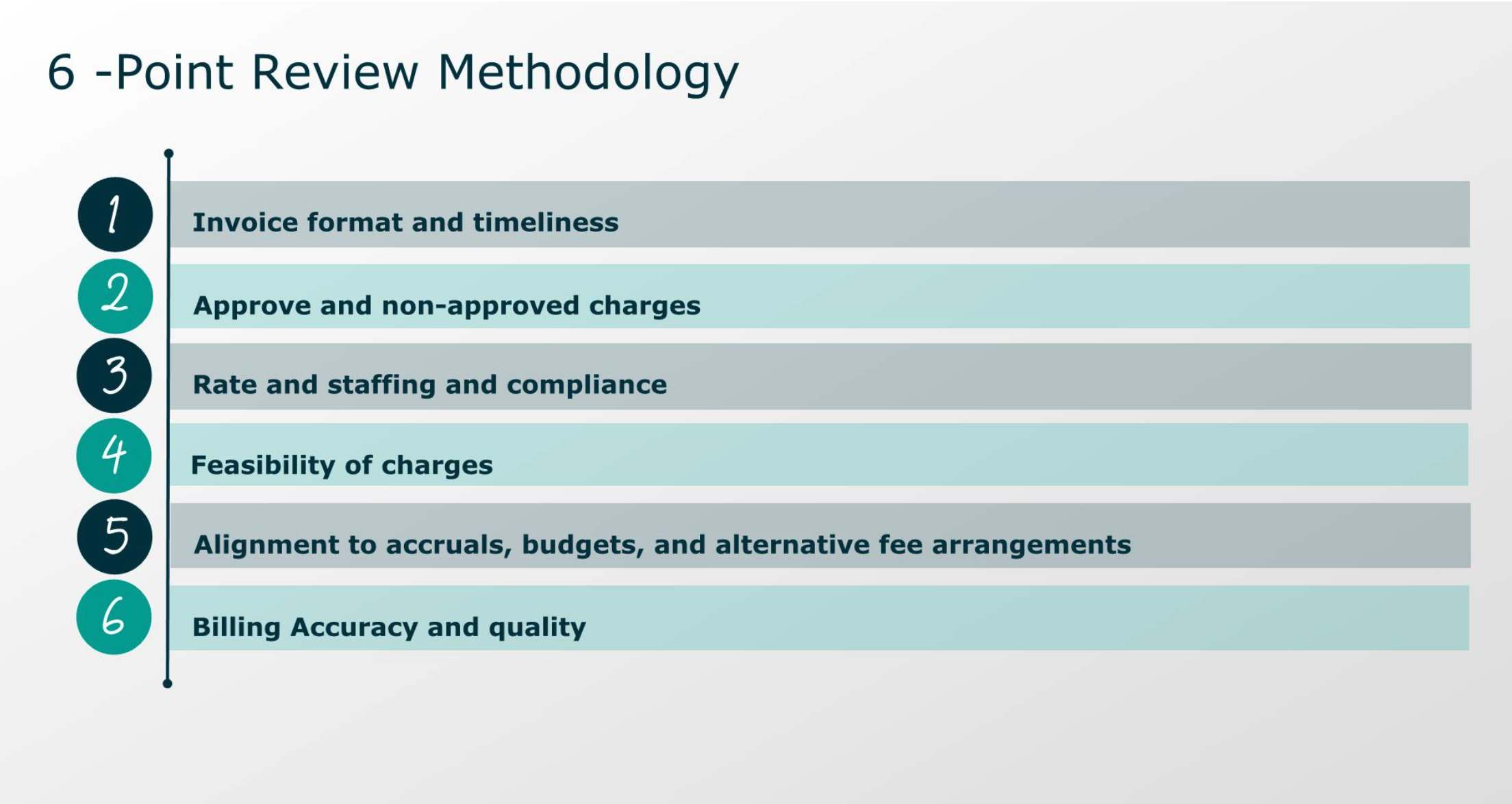- Consistent 7-point methodology to provide outside law firms clarity around billing preferences